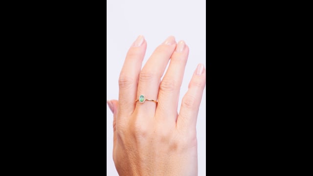 Anel em Ouro 18k cravejado de esmeralda e brilhantes. Tamanho pedra central: 3 x 5mm